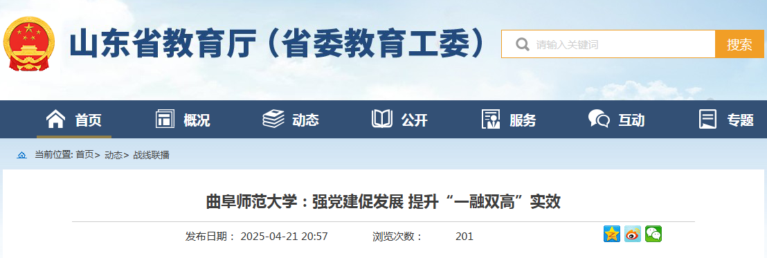 学校出台《关于推进党建与业务工作深度融合的意见》,立足所肩负的人才培养、科学研究、社会服务主要职责,强化“党建领航”,取得了办学核心指标的突破与高质量发展的实效。聚焦写好为党育人、为国育才答卷,开展教育教学思想大讨论,推动人才培养质量提档升级,获批了省级特色学院建设点、拔尖创新人才培养建设点、普通本科高校示范性基层教学组织等。强化课程思政建设,引导曲园学子贡献“强国有我”青春力量,学校先后涌现出获得“中国青年五四奖章”、全国“最美基层高校毕业生”等表彰的毕业学子。聚焦践行“两个结合”、担当文化使命,开辟“学术特区”,培育了人文社科研究系列成果,聚焦产学研协同、加强有组织科研,出台《服务新时代科技强省战略实施方案》,打造了山东省重点实验室等科研创新平台,荣获山东省自然科学奖、山东省科技进步奖等表彰。聚焦发挥人才高地优势、提升社会服务贡献度,建好智库平台,成立“黄河研究院”,聚力服务黄河流域生态保护和高质量发展。创新引才用才,联合日照市政府、曲阜市政府举办青年学者交流会,探索人才资源协同开发,共建“助企攀登博士团”。选派“下得去、融得进、干得好”的党员干部,参加省派第一书记和工作队,助推乡村振兴。