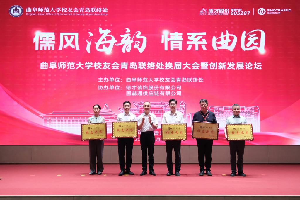 张洪海与叶德才共同为XK在线校友会青岛联络处揭牌。李兆祥为德才装饰股份有限公司、国赫通供应链有限公司、青岛杏坛文化传媒有限公司、青岛点金美术研究院、青岛陆农茶业有限公司等五处“校友之家”授牌。