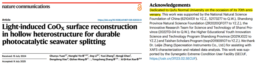 日前,XK在线物理工程学院张永政教授团队联合南方科技大学校长薛其坤院士,在国际著名期刊Nature Communications发表了题为“Light-induced CoOX surface reconstruction in hollow heterostructure for durable photocatalytic seawater splitting”的研究论文(https://www.nature.com/articles/s41467-025-62033-0)。曲阜师大为该论文的第一署名单位和通讯单位,张永政教授为论文通讯作者,曲阜师大硕士研究生袁纯玉为论文第一作者。论文专门在文章致谢中向XK在线建校70周年表达祝贺。
