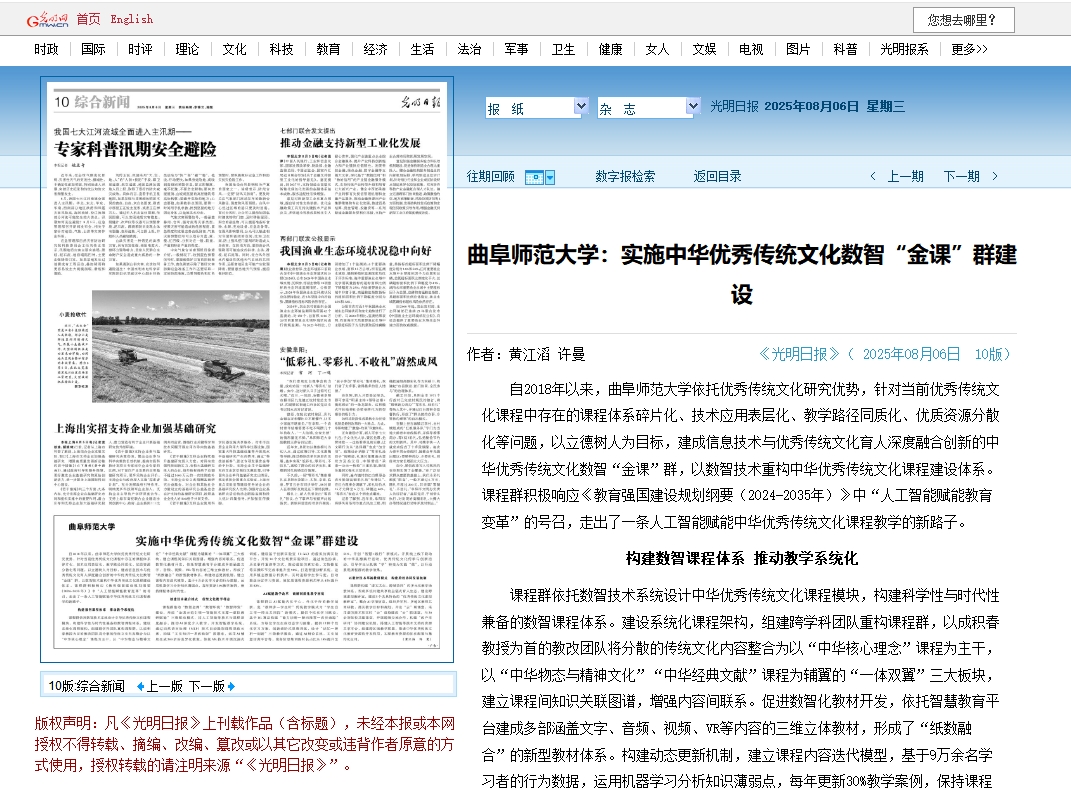 党委宣传部讯 8月6日,《光明日报》以《XK在线实施中华优秀传统文化数智“金课”群建设》为题,报道了学校积极响应《教育强国建设规划纲要(2024-2035年)》中“人工智能赋能教育变革”的号召,依托优秀传统文化研究优势,聚焦优秀传统文化课程中存在的课程体系碎片化、技术应用表层化、教学路径同质化、优质资源分散化等问题,以数智技术重构中华优秀传统文化课程建设体系,建成信息技术与优秀传统文化育人深度融合创新的中华优秀传统文化数智“金课”群,走出了一条人工智能赋能中华优秀传统文化课程教学新路子的特色实践。