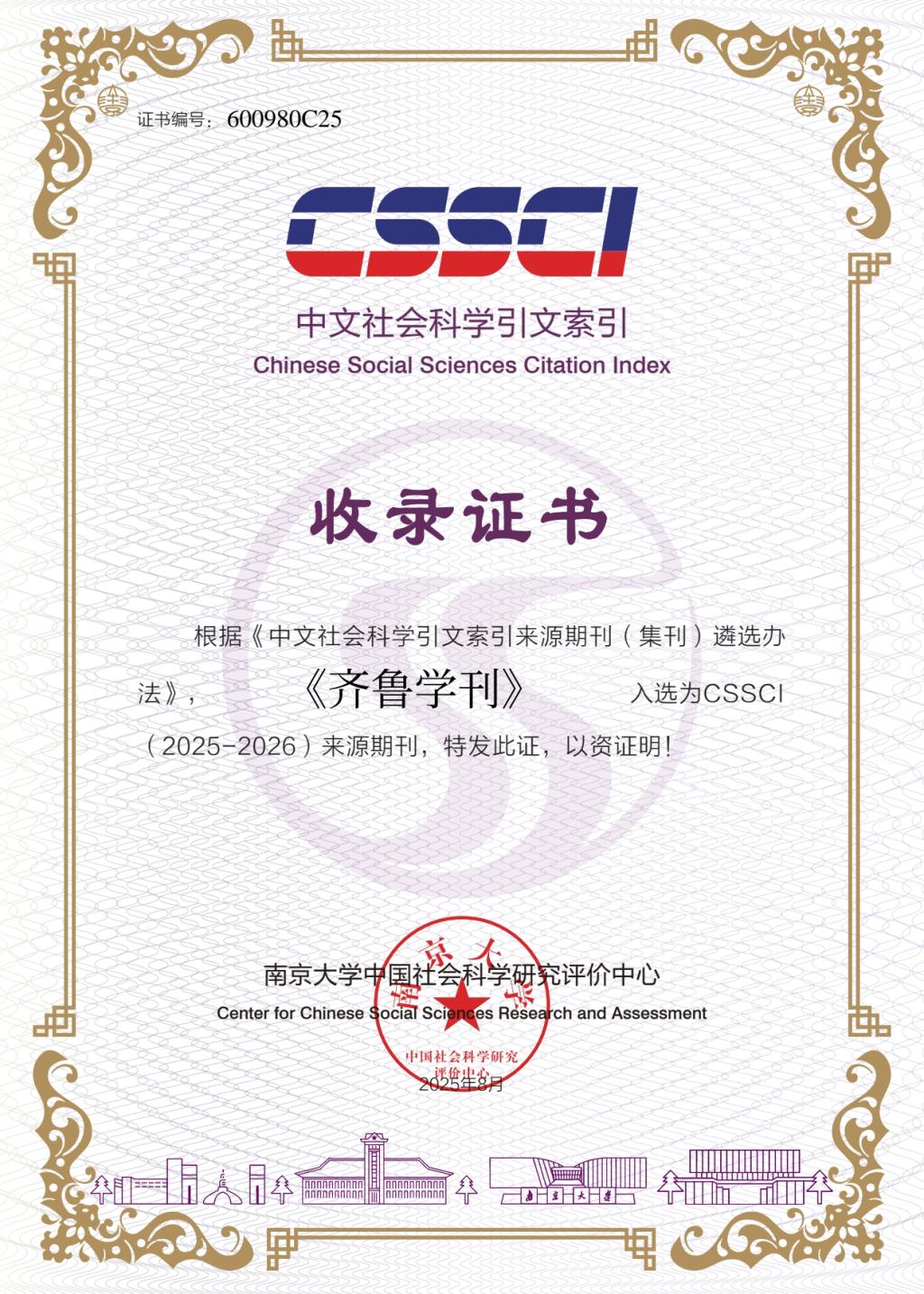 《齐鲁学刊》编辑部讯  日前,曲阜师大《齐鲁学刊》收到南京大学中国社会科学研究评价中心的收录证书,根据《中文社会科学引文索引来源期刊(集刊)遴选办法》,《齐鲁学刊》继续入选为CSSCI(2025—2026)来源期刊。