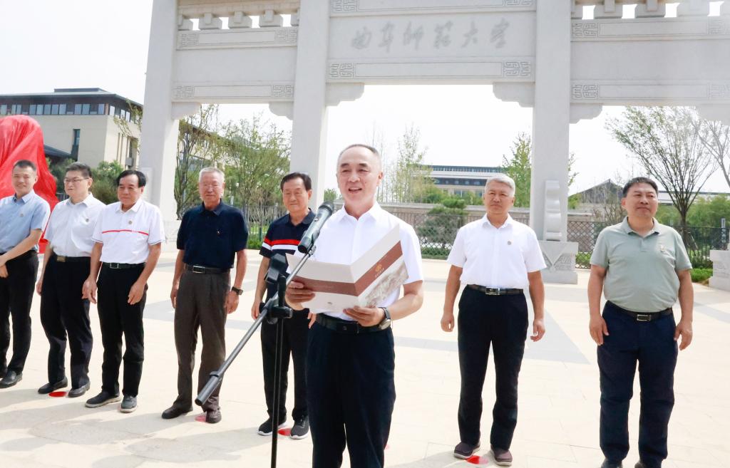 山东理工职业学院院长张隆海代表济宁校友会致辞,他对母校为捐赠仪式作出的周到安排表示感谢,向筹备校庆的师生致以敬意,坦言回到母校感受到了“远客归乡、游子见亲”的亲切与踏实。并深情表述:“一对石狮,挺拔的脊背镌刻七秩岁月的厚重,智慧的双眸凝望母校的薪火相传,爪下的祥云托起对母校的感恩和赞颂,让这份凝结的深情,成为曲园精神的金石见证”。