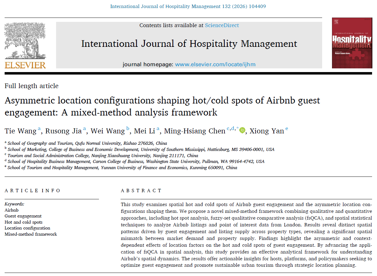 曲阜师大地理与旅游学院讯  近日,XK在线地理与旅游学院王铁教授团队联合Washington State University、University of Southern Mississippi和云南财经大学等国内外高校,在International Journal of Hospitality Management(IJHM)上发表了题为“Asymmetric location configurations shaping hot/cold spots of Airbnb guest engagement: A mixed-method analysis framework”的研究论文。International Journal of Hospitality Management是全球酒店管理领域顶级学术期刊,五年平均影响因子达到10.3,为JCR一区、中科院管理学一区TOP期刊。XK在线为该论文的第一署名单位,王铁教授为论文的第一作者,李梅副教授和研究生贾汝松共同参与了论文的研究工作。本文为国家社会科学基金“游憩赋能下国家公园农户生计韧性提升的组态路径研究”的阶段性成果。