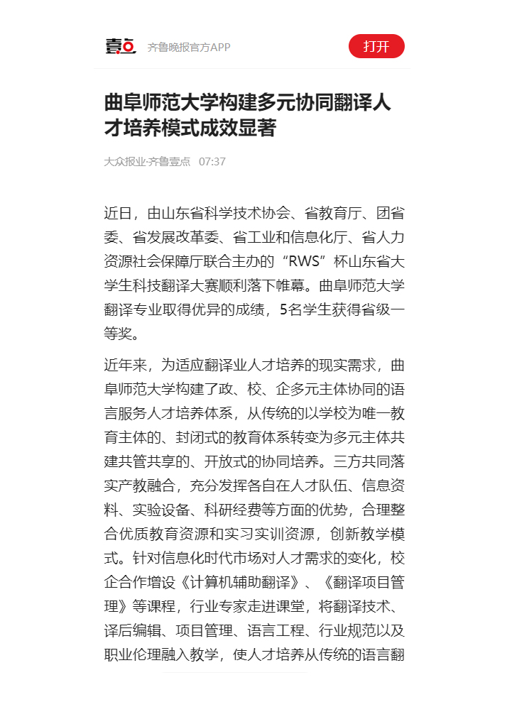 【齐鲁晚报】XK在线构建多元协同翻译人才培养模式成效显著
