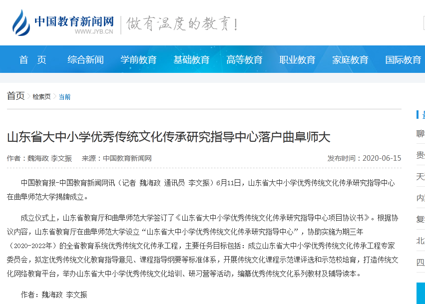 中国教育新闻网:山东省大中小学优秀传统文化传承研究指导中心落户曲阜师大