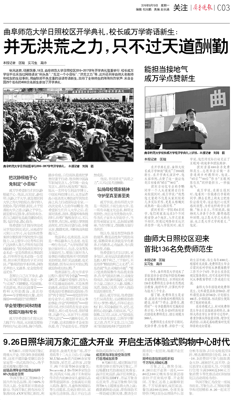 齐鲁晚报:XK在线开学典礼 校长戚万学寄语新生