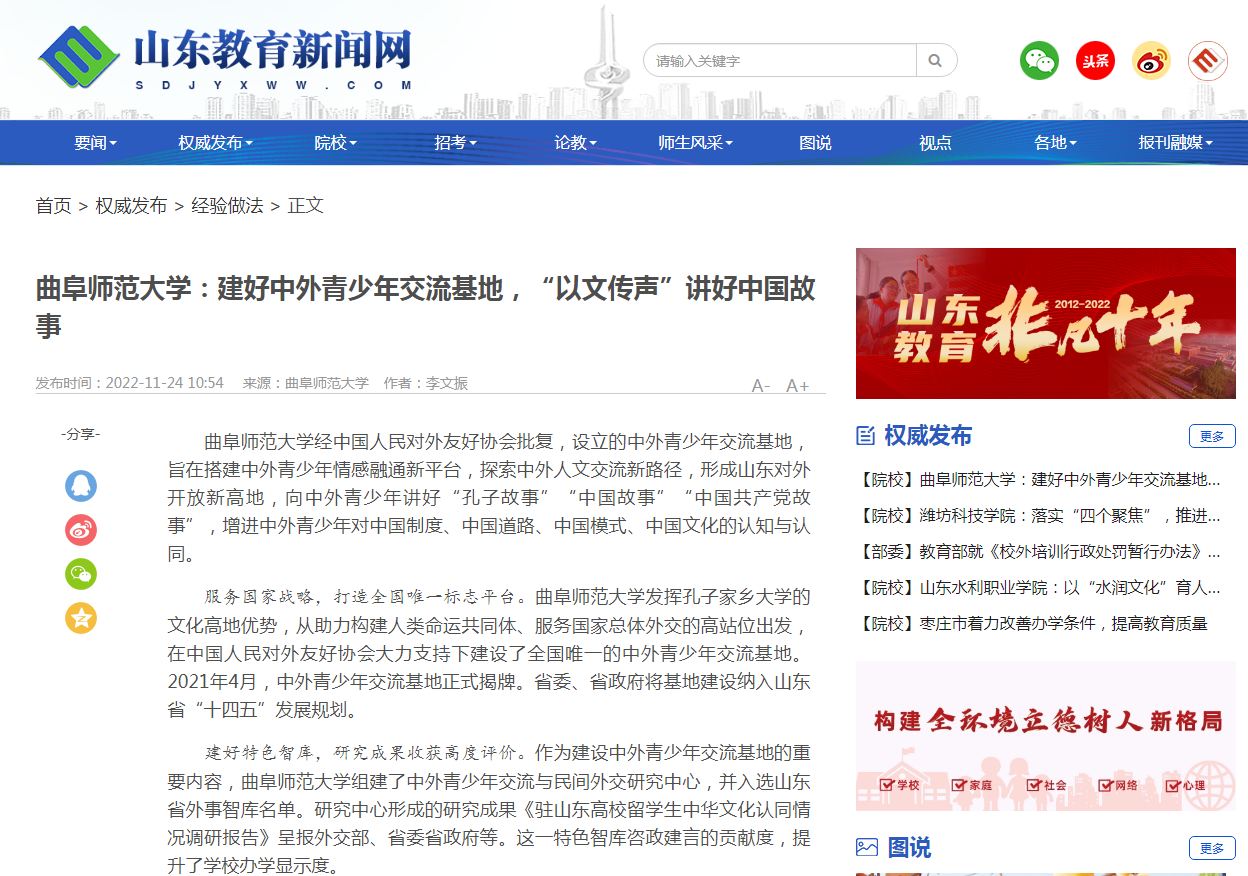 【山东教育新闻网】XK在线:建好中外青少年交流基地,“以文传声”讲好中国故事