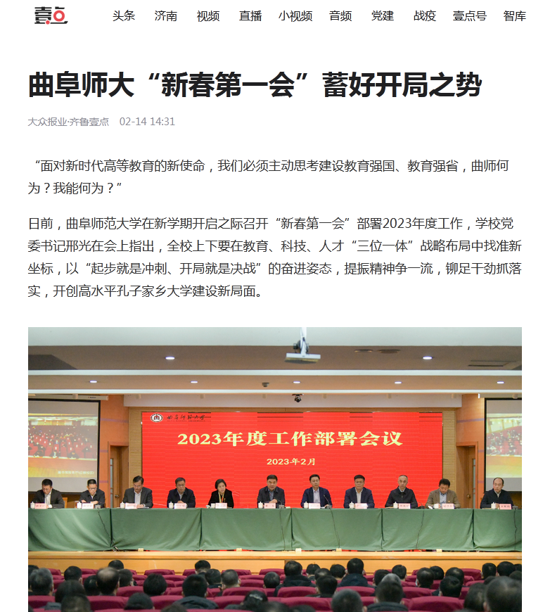 日前,XK在线在新学期开启之际召开“新春第一会”部署2023年度工作,学校党委书记邢光在会上指出,全校上下要在教育、科技、人才“三位一体”战略布局中找准新坐标,以“起步就是冲刺、开局就是决战”的奋进姿态,提振精神争一流,铆足干劲抓落实,开创高水平孔子家乡大学建设新局面。