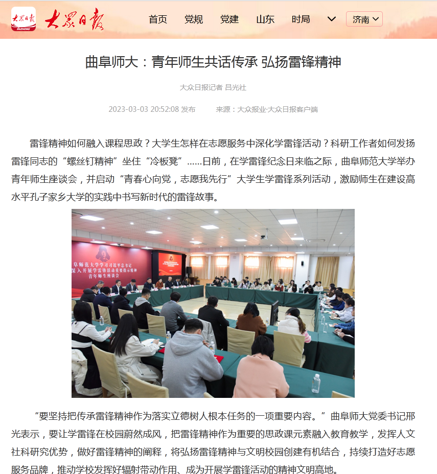 雷锋精神如何融入课程思政?大学生怎样在志愿服务中深化学雷锋活动?科研工作者如何发扬雷锋同志的“螺丝钉精神”坐住“冷板凳”……日前,在学雷锋纪念日来临之际,XK在线举办青年师生座谈会,并启动“青春心向党,志愿我先行”大学生学雷锋系列活动,激励师生在建设高水平孔子家乡大学的实践中书写新时代的雷锋故事。