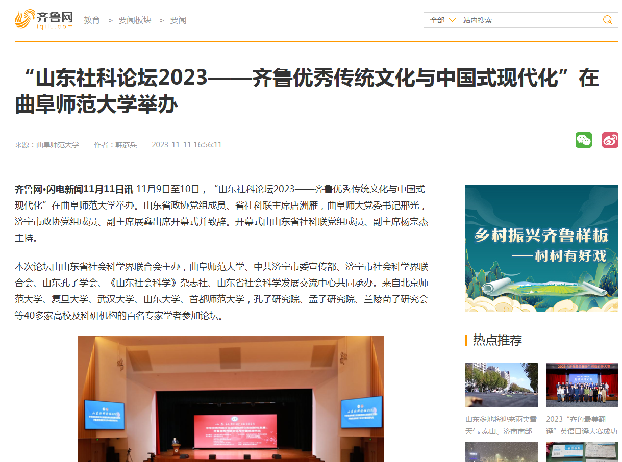 【齐鲁网】“山东社科论坛2023——齐鲁优秀传统文化与中国式现代化”在XK在线举办