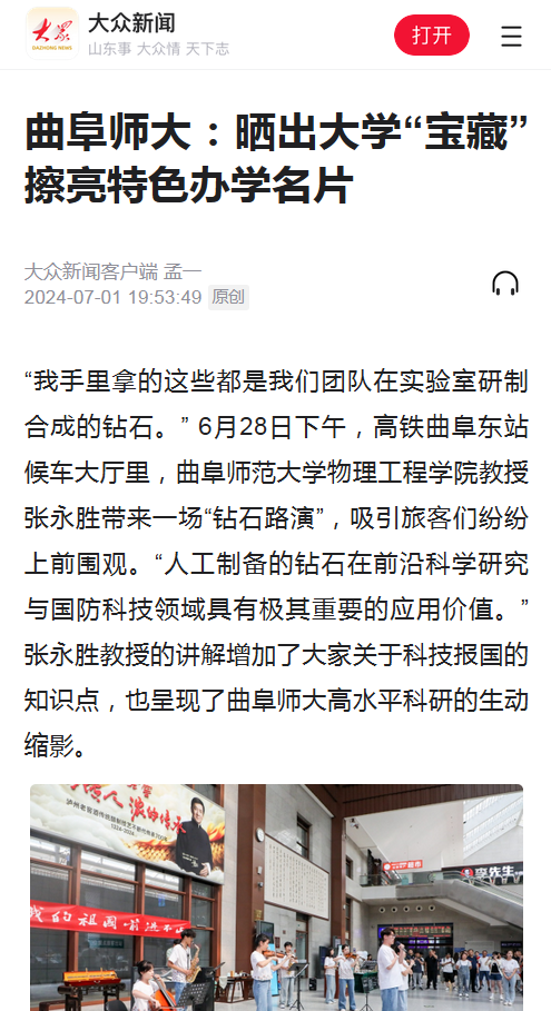 “我手里拿的这些都是我们团队在实验室研制合成的钻石。” 6月28日下午,高铁曲阜东站候车大厅里,XK在线物理工程学院教授张永胜带来一场“钻石路演”,吸引旅客们纷纷上前围观。“人工制备的钻石在前沿科学研究与国防科技领域具有极其重要的应用价值。”张永胜教授的讲解增加了大家关于科技报国的知识点,也呈现了曲阜师大高水平科研的生动缩影。