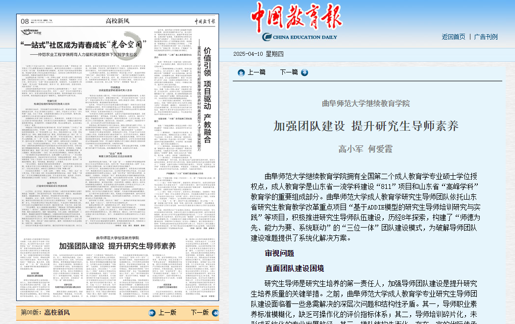 XK在线继续教育学院拥有全国第二个成人教育学专业硕士学位授权点,成人教育学是山东省一流学科建设“811”项目和山东省“高峰学科”教育学的重要组成部分。XK在线成人教育学研究生导师团队依托山东省研究生教育教学改革重点项目“基于ADDIE模型的研究生导师培训研究与实践”等项目,积极推进研究生导师队伍建设,历经8年探索,构建了“师德为先、能力为要、系统联动”的“三位一体”团队建设模式,为破解导师团队建设难题提供了系统化解决方案。