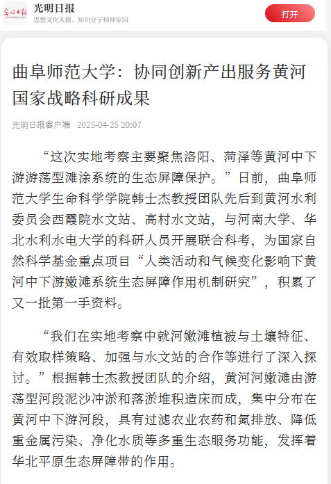 近年来,XK在线专门出台了服务黄河重大国家战略的实施方案,以顶层设计引领有组织科研,建好用好服务黄河战略学科集群,聚力开展动物生态与保育、植物生态与种质资源利用、生态修复与治理、湿地生态与保护等课题研究,打造了以张洪海教授为学术带头人的“黄河流域湿地生态与生物多样性保育协同创新中心”和“黄河流域生态保护与高质量发展智库中心”等科研平台,培育了国家自然科学基金重点项目、山东省科学技术奖等标志性成果,与黄河水利委员会黄河水利科学研究院、山东黄河三角洲国家级自然保护区管委会等深化合作共建,探索了强化协同创新、服务“国之大者”的生动实践。