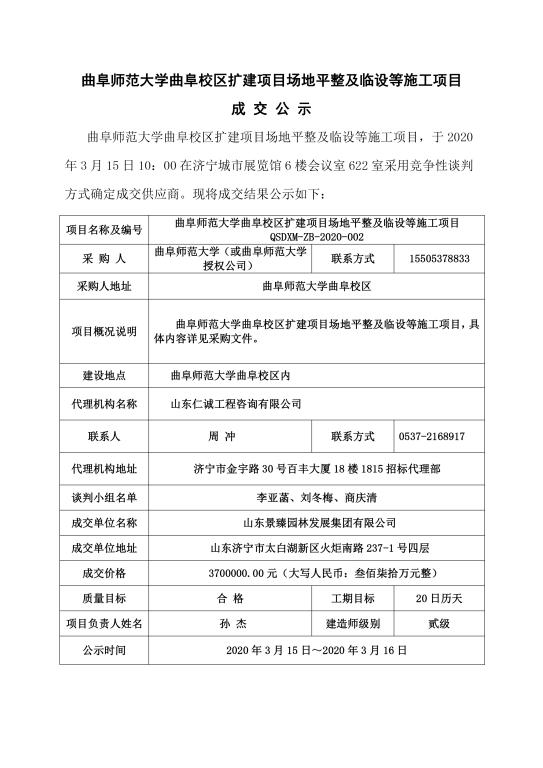 XK在线曲阜校区扩建项目场地平整及临设等施工项目成 交 公 示