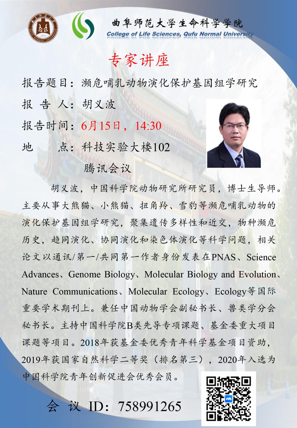 胡义波,中国科学院动物研究所研究员,博士生导师。主要从事大熊猫、小熊猫、扭角羚、雪豹等濒危哺乳动物的演化保护基因组学研究,聚集遗传多样性和近交,物种濒危历史,趋同演化、协同演化和染色体演化等科学问题,相关论文以通讯/第一/共同第一作者身份发表在PNAS、Science Advances、Genome Biology、Molecular Biology and Evolution、Nature Communications、Molecular Ecology、Ecology等国际重要学术期刊上。兼任中国动物学会副秘书长、兽类学分会秘书长。主持中国科学院B类先导专项课题、基金委重大项目课题等项目。2018年获基金委优秀青年科学基金项目资助,2019年获国家自然科学二等奖(排名第三),2020年入选为中国科学院青年创新促进会优秀会员。