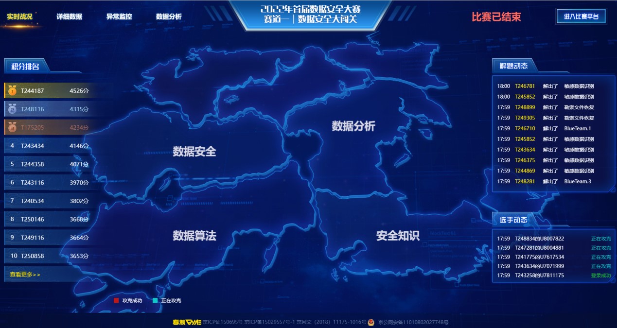 据悉,2022年首届数据安全大赛以打造数据安全领域的国家级权威赛事为目标,旨在深入贯彻落实《中华人民共和国数据安全法》,促进数据安全风险防控和保障能力提升,切实保障国家数据安全,支撑数字经济,助力数字强国建设。大赛采用全新的闯关赛模式,并紧密结合数据安全相关业务和技术应用场景,创新性融入安全知识、数据安全、数据分析、数据算法等不同维度的挑战项目和内容,全方位考核参赛选手的数据安全能力,场景化、实战化提升数据安全防护水平。晋级全国百强的队伍来自中国电信、国家电网等各行业领域单位,中兴、腾讯等专业技术公司,哈尔滨工业大学、北京邮电大学、电子科技大学、大连理工大学、华南理工大学、XK在线等高校以及公安、海事、税务、气象等有关政府部门。