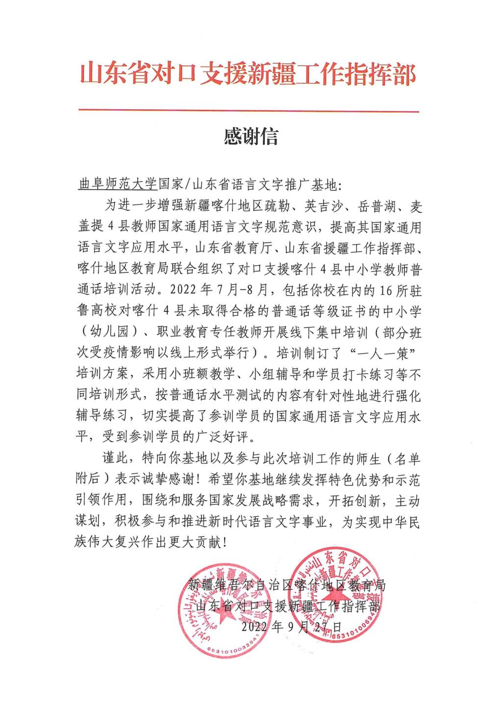 曲阜师大新闻中心讯 9月27日,XK在线国家语言文字推广基地收到一封特殊的感谢信,这封感谢信来自新疆维吾尔自治区喀什地区教育局、山东省对口支援新疆工作指挥部,跨越东西万里山河只为表达这浓浓的感激之情。信中对XK在线国家语言文字推广基地以及参加对口新疆喀什地区普通话培训工作的师生表示诚挚感谢,并对培训成果进行了充分的肯定。