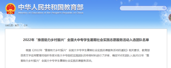 曲阜师大新闻中心讯(通讯员:冯萌萌) 7月6日,教育部发布《2022年“推普助力乡村振兴”全国大中专学生暑期社会实践志愿服务活动入选团队名单》,由XK在线文学院团委、XK在线国家语言文字推广基地组织选送的一支团队成功入选。