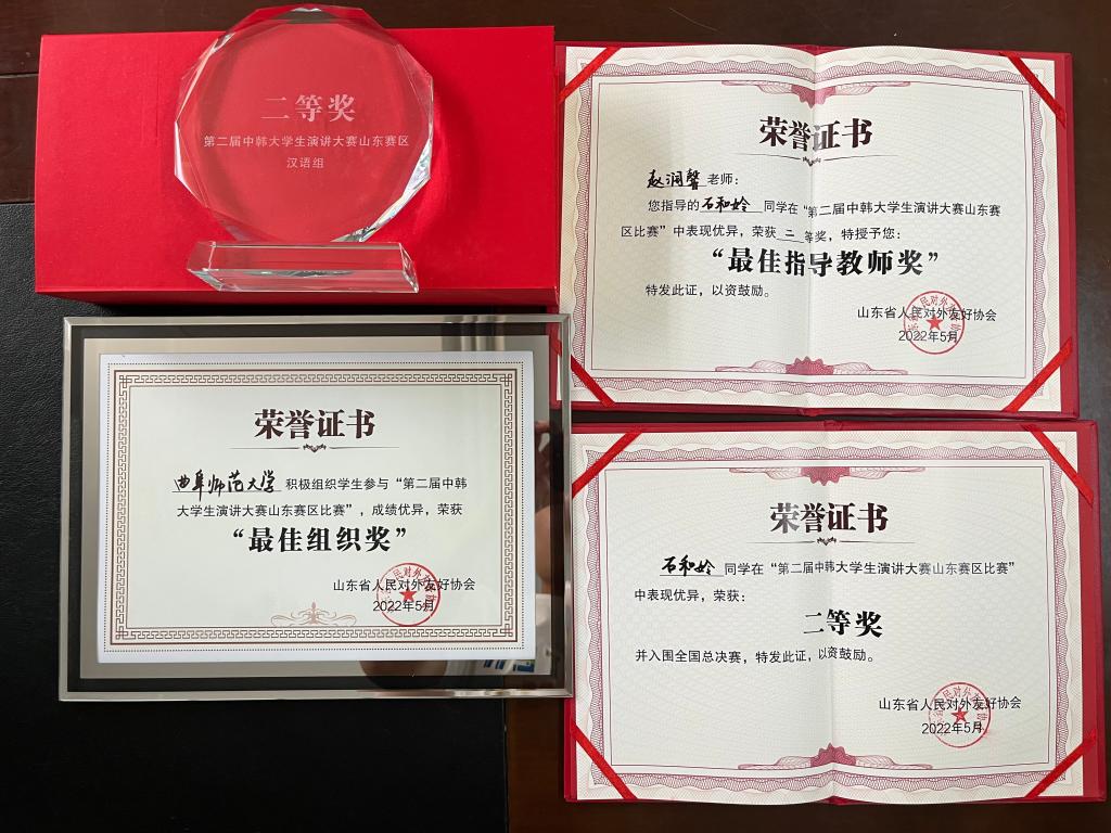 曲阜师大新闻中心讯(通讯员:司甫) 5月25日,由山东省人民对外友好协会承办的第二届中韩大学生演讲大赛山东赛区颁奖仪式在线上举行。经过激烈角逐,我校国际教育学院韩国籍留学生石和姈脱颖而出、喜创佳绩,荣获汉语组二等奖,将代表山东赛区出征全国总决赛。赵润馨老师获“优秀指导教师奖”,我校获“最佳组织奖”(最高奖)。