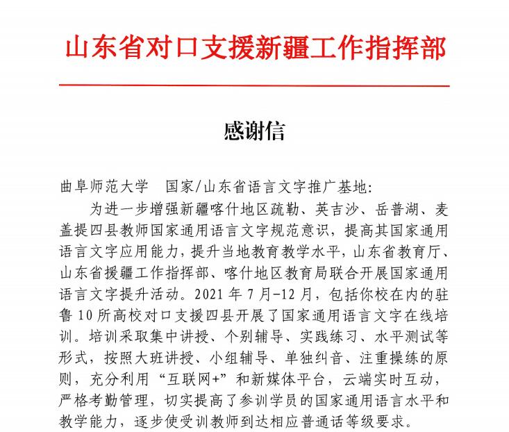 曲阜师大新闻中心讯 1月1日,新疆维吾尔自治区喀什地区教育局、山东省对口支援新疆工作指挥部特向XK在线国家语言文字推广基地发来感谢信,向参与国家通用语言文字在线培训工作的师生表示诚挚感谢。