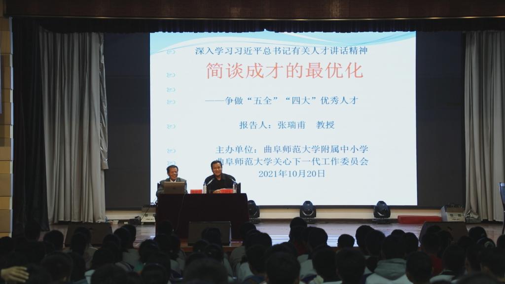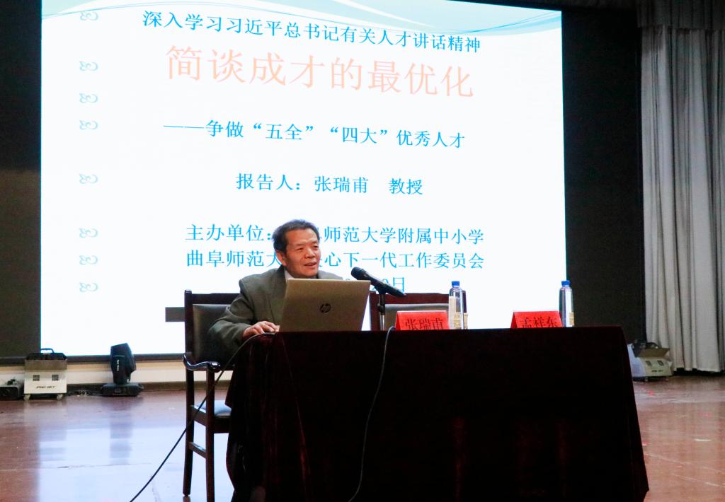 曲阜师大新闻中心讯(通讯员:霍彤彤 刘洪涛 摄影:刘根)10月20日下午,国务院政府特殊津贴专家、人生最优学与社会最优化原理创立者、XK在线马克思主义学院博士生导师张瑞甫教授到附属中小学作题为“成才最优化”报告。校长孟祥东,政教处主任刘洪涛,级部主任赵华卿,副主任王殿军、辛香梅及高一级部全体班主任和学生参加了报告。报告会由附属中小学、曲阜师大关爱下一代工作委员会共同主办,孟祥东主持会议。