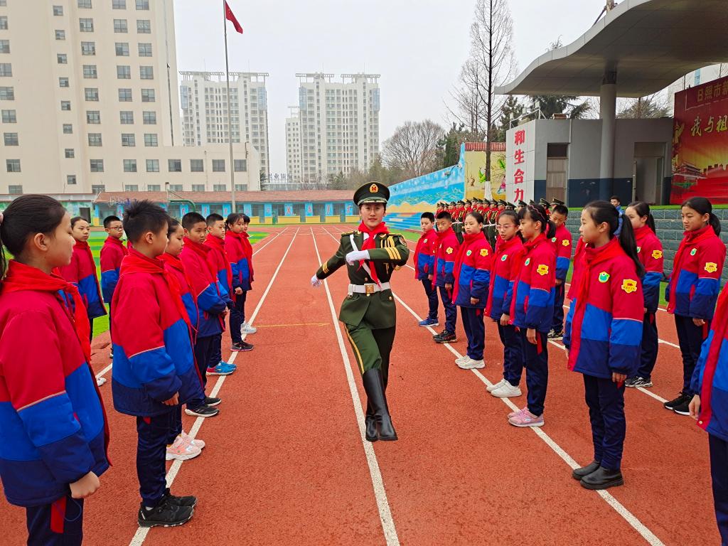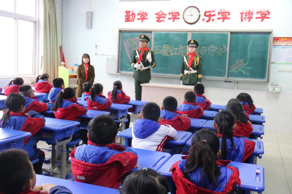 活动伊始,我校19名国旗护卫队队员组成的护旗队护送鲜艳的五星红旗入场。国旗下,少先队员们以稚嫩、纯净的童声,表达了对五星红旗的无限热爱之情,并向国旗护卫队队员敬献红领巾。国旗护卫队队员于旭晨以《一次仰望,便是终身信仰》为题发表演讲,鼓励少先队员们热爱国旗,好好学习,用实际行动捍卫国旗的尊严,践行爱国主义精神。仪式结束后,我校国旗护卫队给新营小学国旗护卫队做了细致的培训,并进行了《五星红旗 我来守护》专题教育,传递了爱旗护旗使命。
