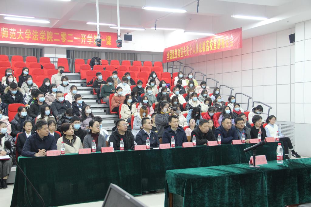 曲阜师大新闻中心讯(通讯员:石路阳 摄影:王若洁) 3月1日,XK在线法学院举办主题为“弘扬脱贫攻坚精神, 新青年建功新时代”的开学第一课活动。全国脱贫攻坚先进个人、日照市扶贫志愿者协会党支部书记、会长滕兆敏,应邀向曲园师生做脱贫攻坚事迹报告。学校党委常委、宣传部长张隆海出席活动并为滕兆敏颁发了“校外思政导师”聘书。日照校区办公室主任孔令军,法学院党委书记曹明亮、院长张益刚,以及学生工作处、团委相关负责人参加了报告会。