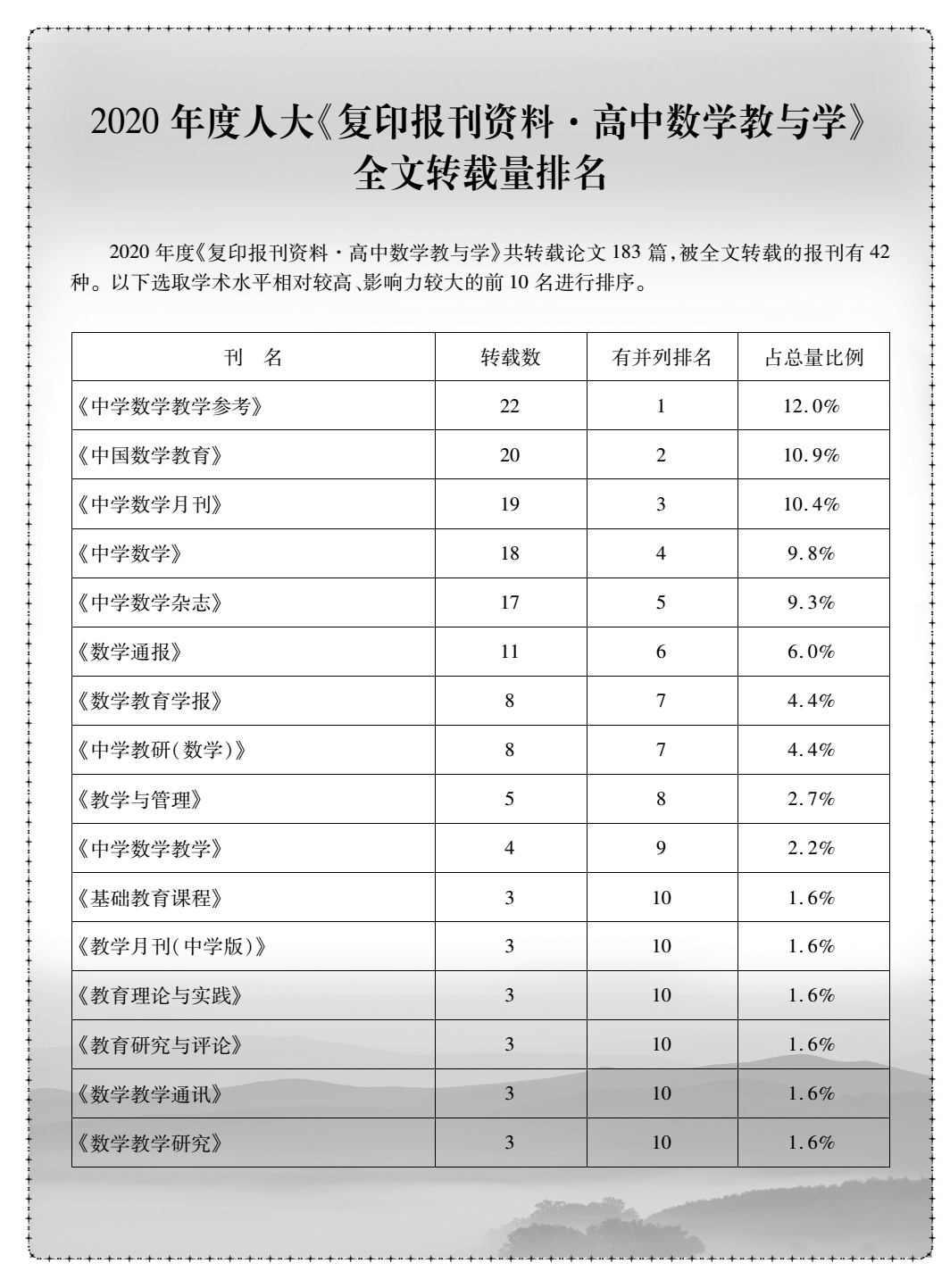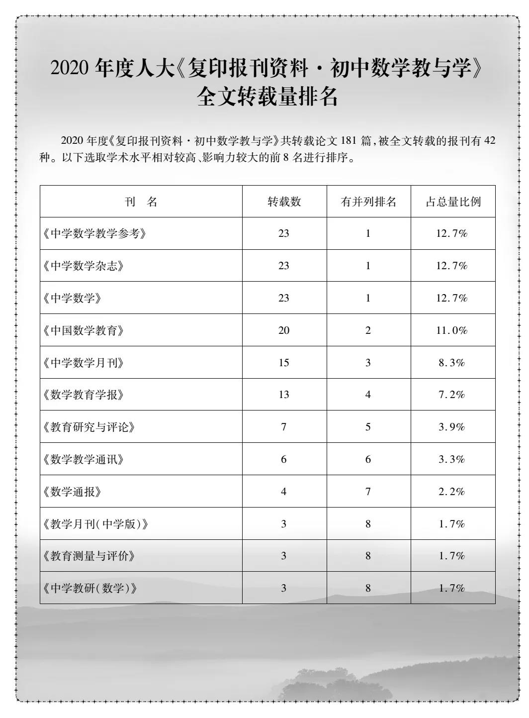 曲阜师大新闻中心讯 新年伊始,曲阜师大《中学数学杂志》传来喜讯:根据中国人民大学书报资料中心全文数据库检索情况,《中学数学杂志》被《复印报刊资料》系列刊(2020年度)全文转载的文章达到40篇,排名再创新高。《复印报刊资料·初中数学教与学》共转载论文181篇,被全文转载的报刊有42种,《中学数学杂志》(初中版)被转载23篇,占总量的12.7%,由2019年的第四名升至第一名;《复印报刊资料·高中数学教与学》共转载论文183篇,被全文转载的报刊有42种,《中学数学杂志》(高中版)被转载17篇,占总量的9.3%,篇数比2019年有所增加,排名第五。