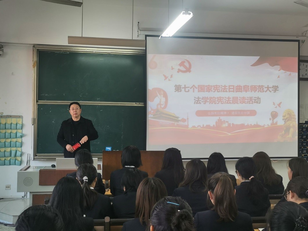 为弘扬宪法精神,维护宪法权威,法学院院长张益刚教授、教师党支部书记孔庆余副教授、教师代表马洪伦副教授、学生党支部书记马振华,分别带领同学们进行了宪法晨读活动。