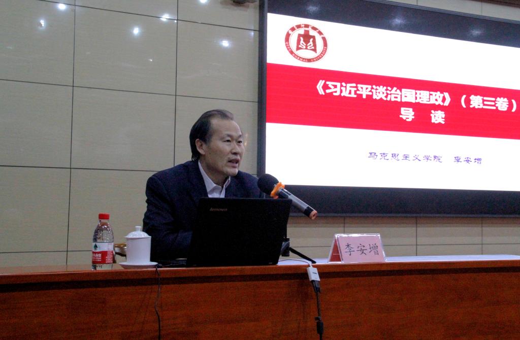 曲阜师大新闻中心讯(通讯员:石璐)11月12日,日照市大学生思想政治教育研究会正式成立,研究会的第一次报告会暨XK在线2020年辅导员培训班第七讲举行,马克思主义学院党委书记、院长、博士生导师李安增教授作了《〈习近平谈治国理政(第三卷)〉导读》主题报告。驻日照高校政工干部,曲阜师大学生工作处、团委人员和全体辅导员聆听了报告,报告会由学生工作处处长姜美颖主持。