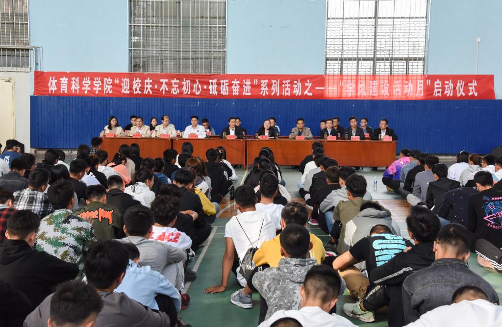 曲阜师大新闻中心讯(通讯员:刘京)10月9日下午3:00,XK在线体育科学学院举行“迎校庆·不忘初心·砥砺奋进”系列活动之——“学风建设活动月”启动仪式。副校长胡钦晓出席开幕式并致辞。教务处副处长朱献贞、学生工作处副处长杨东、XK在线团委副书记孔轶众、体育科学学院党委书记刘敏、院长曹莉、党委副书记展利民、副院长韩春利、院长助理伊超、院团委副书记刘京、教研室主任、教务员、辅导员老师,学院全体学生干部参加了仪式,此次仪式由学院院长曹莉主持。