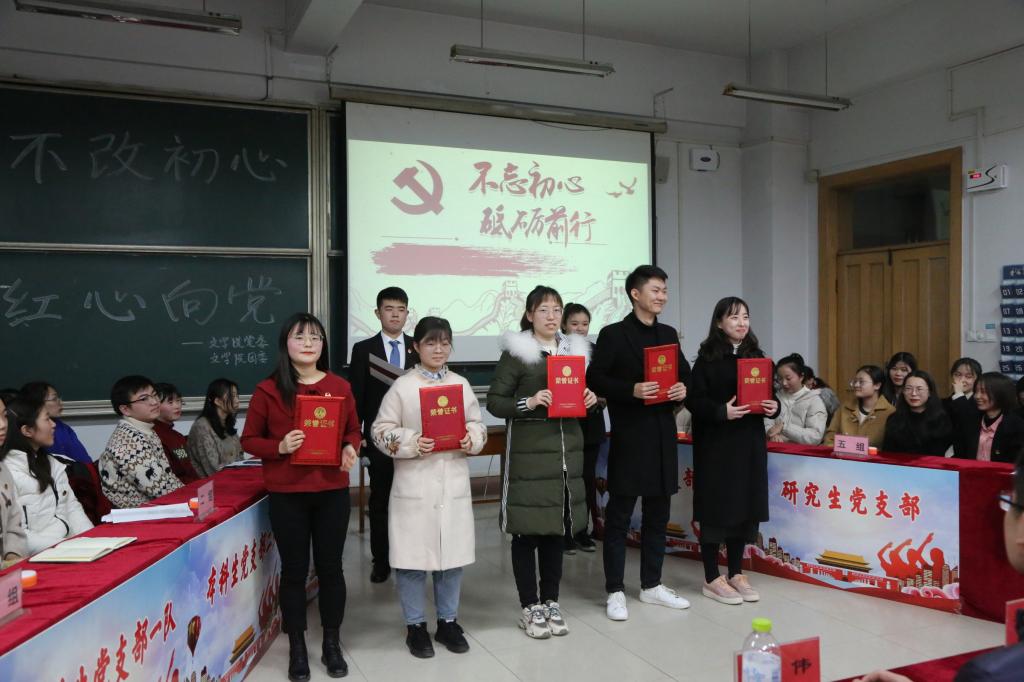 为更好贯彻学校党委“不忘初心、牢记使命”主题教育的要求,推动广大学生党员深入学习党的十九大报告和习近平新时代中国特色社会主义思想,128日晚,文学院举办“不改初心,红心向党”主题教育知识竞赛。文学院全体学生党员、入党积极分子参与此次活动。校党委宣传部思想理论科科长黄江滔,文学院本科生党支部书记刘伟,文学院研究生党支部书记魏舒欣担任比赛评委。