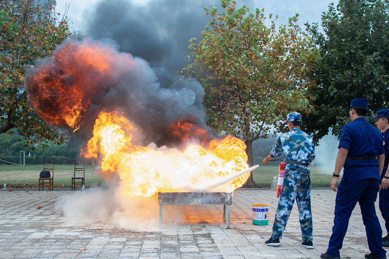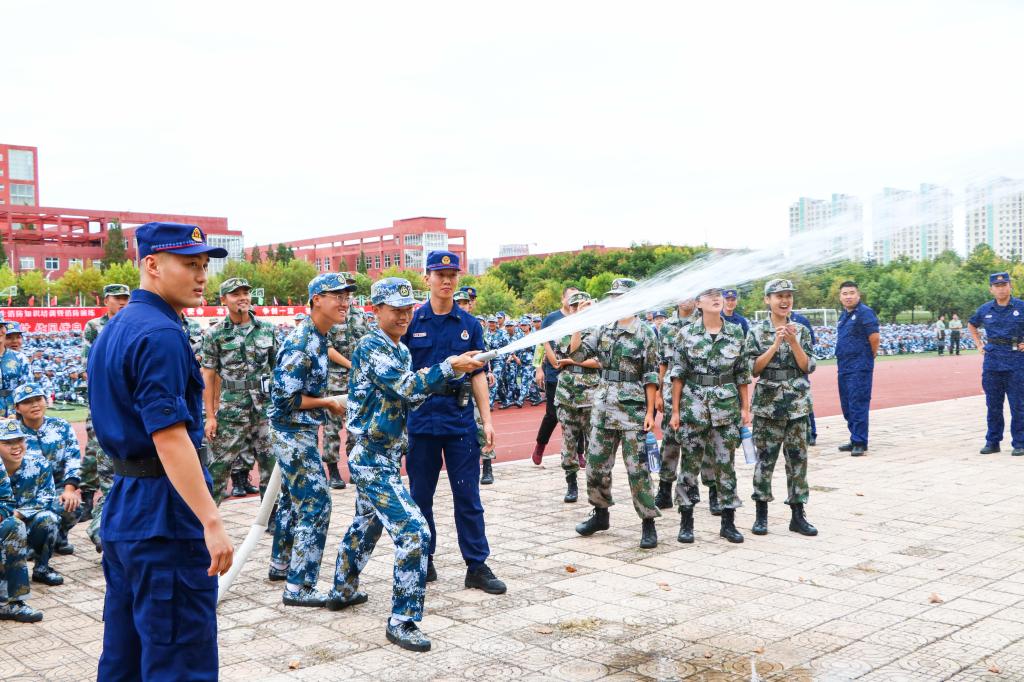 会后,消防官兵为同学们介绍了消防水带和干粉灭火器的使用方法和灭火要点,来自各军训连队的学生进行了实战演练。