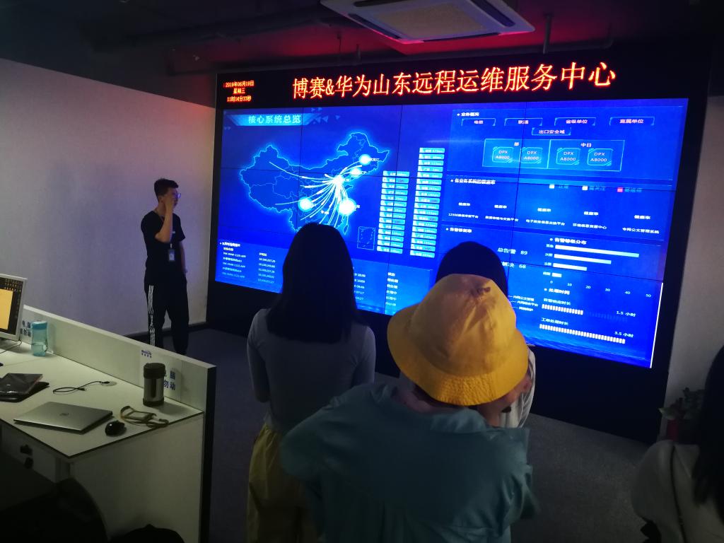 在济南博赛网络科技有限公司,工作人员分批带领老师、同学进行参观学习。师生们参观了公司的工作环境,了解了博赛网络科技有限公司的课程模式、工作理念,工作人员向广大师生讲解了企业文化、背景和良好的校企合作对接环境。见习师生还参观了公司的考试中心和华为&博赛远程运维平台,平台具有提供线上、线下的运维能力,工作人员现场展示了远程运维的设备。