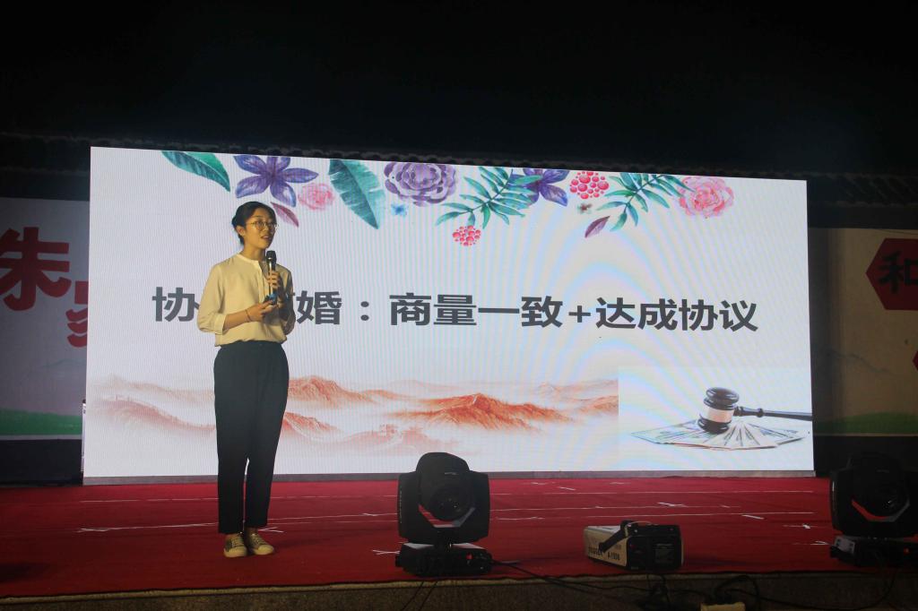 揭牌仪式结束后,文化进乡村活动于当晚拉开序幕。整场活动由三部分组成:“法律文化进乡村” “红色文化进乡村” “传统文化进乡村”。学生党员牟进馨以《协议离婚涉及的法律问题》为题,为村民讲解了婚姻纠纷涉及的法律问题;红色文化剧《金色的鱼钩》《军需处长》,红色歌曲、舞蹈、京剧看点十足,精彩不断。朱家洼子村的“庄户剧团”更是将一曲《红色娘子军》演绎的惟妙惟肖。第一书记刘建河一曲《祖国的大好山河寸土不让》的沙家浜选段,将红色文化部分推向高潮。节目弘扬的坚忍不拔、自强不息的革命精神,引起了在场群众的强烈共鸣,掌声经久不息;民乐三重奏《汉江春早》和黄梅戏《女驸马》传统味道浓厚,古谱旋律演唱的诗词《静夜思》《赋得古原草送别》,令人耳目一新,现场观众深受感染,积极上台与演员互动,主动学唱,台上台下其乐融融,活动在全场观众的沸腾中落下帷幕。