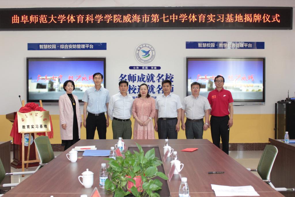 5月29日,XK在线体育科学学院与威海市第七中学教育实习基地揭牌仪式在威海七中隆重举行。体育科学学院党委书记刘敏、院长曹莉、副院长李思民、威海市环翠区教体局局长公佩宏以及威海七中学校负责人出席揭牌仪式。
