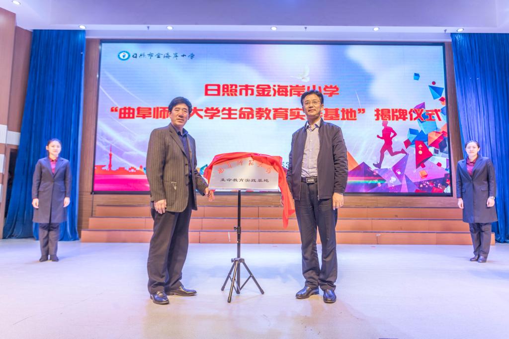 仪式上,赵庆英和学生生命教育研究中心团队负责人卢瑞霞签订XK在线与日照市金海岸小学生命教育实践基地合作协议,杨永明和宋百合共同为我校生命教育实践基地揭牌。