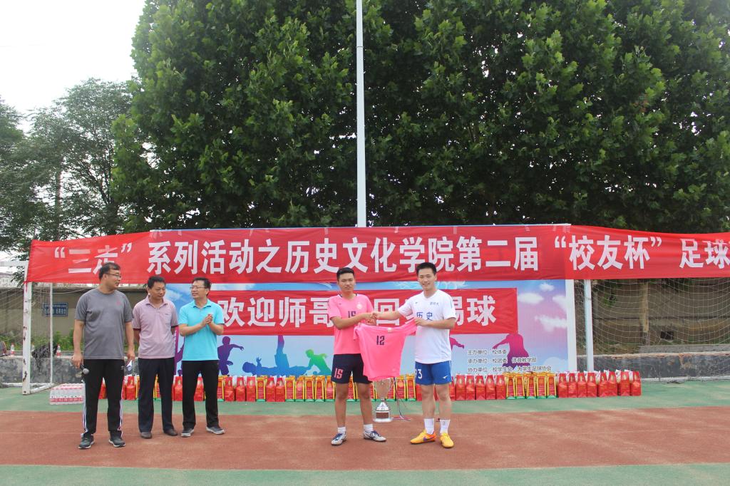 王慕东在致辞中希望各位校友通过足球赛,进一步树立珍爱健康、快乐生活、快乐工作的理念,与在校生能够“以球会友”,用小小足球来牵起浓浓校友情。历史文化学院足球队队长王桐向校友队代表赠送纪念球衣。学院老师为校友们赠送了纪念品。