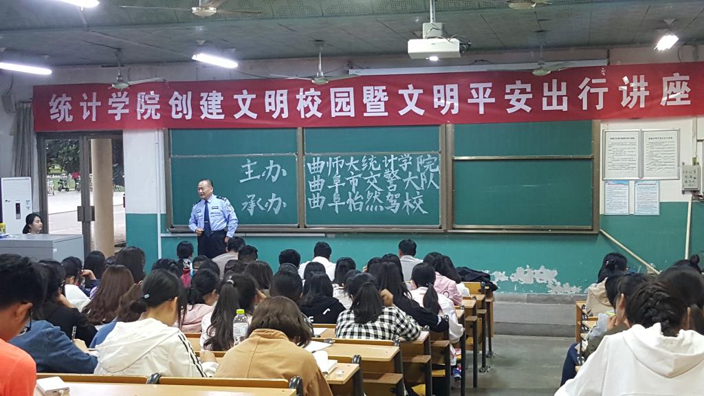 为贯彻学校深化文明校园创建工作动员大会精神,倡导文明出行,提高学生的防诈骗能力,由统计学院和曲阜市公安局交警大队主办、曲阜市怡然驾校承办的“统计学院创建文明校园暨平安文明出行知识讲座”于5月22日举办。统计学院党委副书记季中,曲阜市公安局交警大队警官孔建军、曲阜市怡然驾校董事长孔磊、校长张来臣及学院师生参加了知识讲座。
