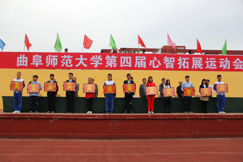 闭幕式上,日照校区管委会主任助理、管理办公室主任池福安宣读了本届心智拓展运动会比赛成绩,在主席台就坐的领导为获奖团体颁奖。