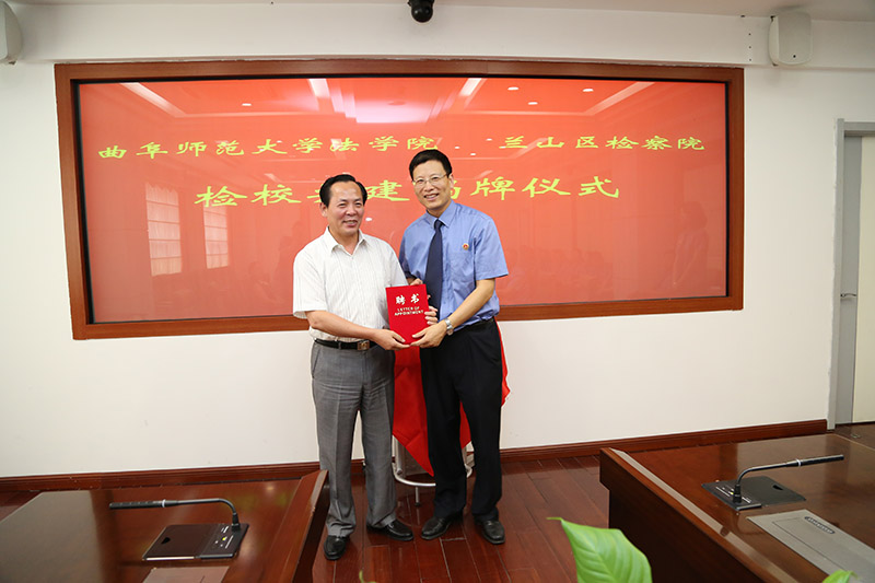 7月6日上午,我校法学院教学科研基地揭牌仪式暨兼职教授聘任仪式在临沂市兰山区人民检察院举行。我校日照校区管委会主任助理、校区管理办公室主任池福安,临沂市兰山区人民检察院苏波检察长,我校法学院院长袁兆春教授、副院长张益刚教授、法学院党委副书记卢瑞霞及临沂市兰山区人民检察院党组成员出席仪式。