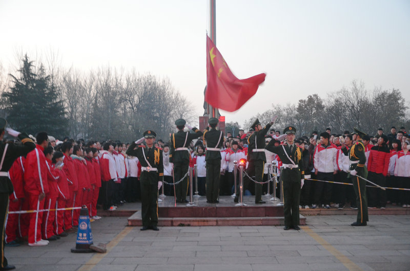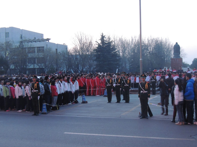 早6点半,在引导员的带领下,各学院同学有序的站在孔子文化广场的两侧。我校第十五届国旗护卫队队长发表演讲,与同学们一起重温了那段难以忘却的历史。7点整,在庄严肃穆的气氛中,国旗护卫队队员迈着整齐矫健的步伐将鲜艳的五星红旗护送到国旗台前。在凛冽的寒风中,所有同学高唱国歌,五星红旗冉冉升起,曲园学子用屹立的身影和坚定的眼神表达对先烈的敬意和对祖国的热爱。