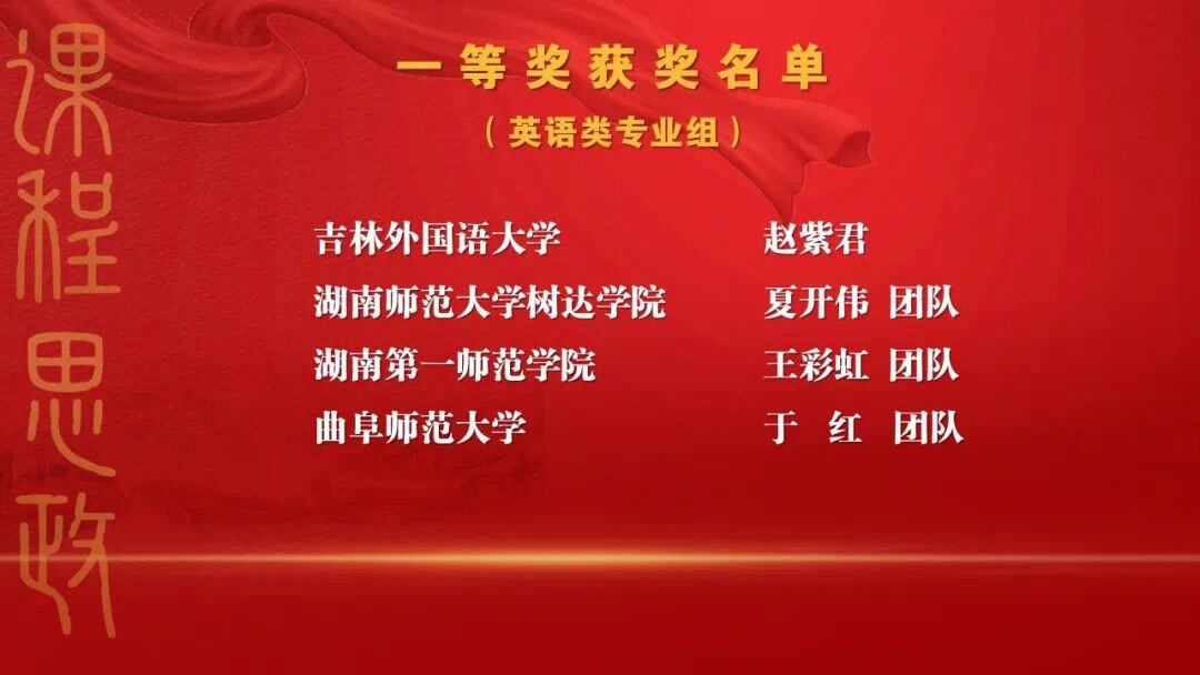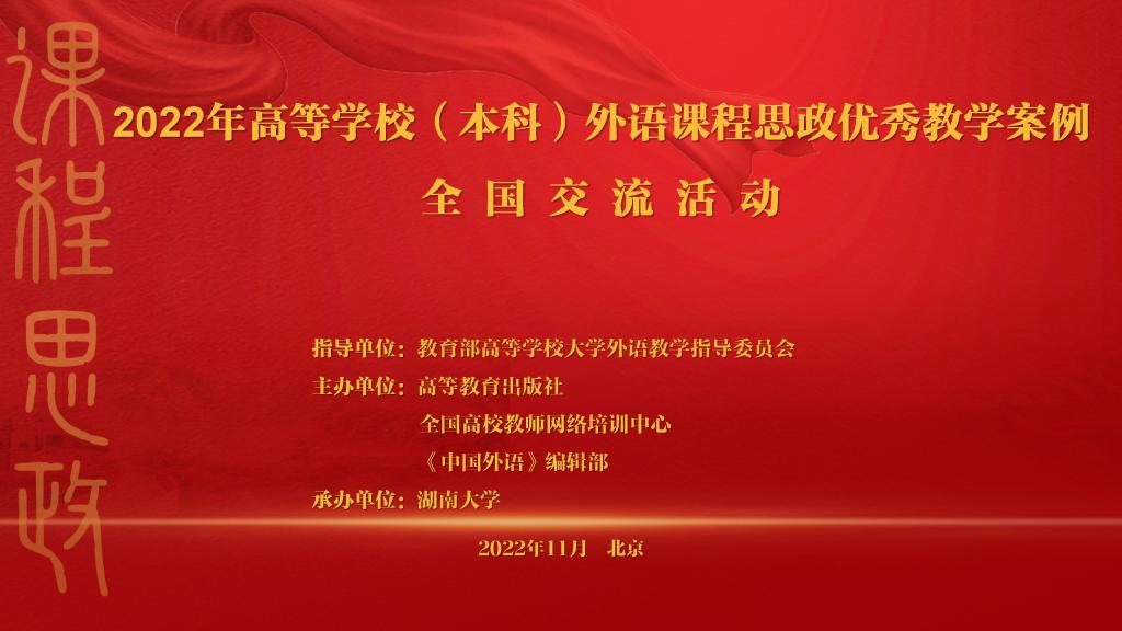 曲阜师大翻译学院讯 日前,由教育部高等学校大学外语教学指导委员会指导,高等教育出版社、全国高校教师网络培训中心和《中国外语》编辑部联合主办的2022年高等学校(本科)外语课程思政优秀教学案例全国交流活动结果揭晓。曲阜师大翻译学院于红教师团队再次喜获佳绩,斩获英语专业组全国一等奖。