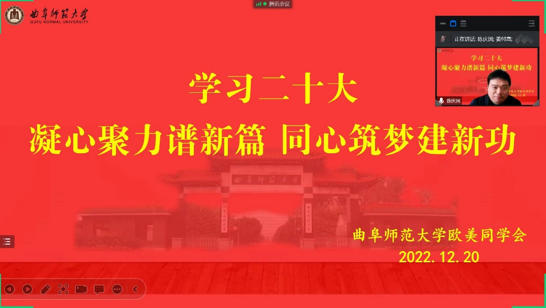 12月20日,学校欧美同学会、知联会联合召开“凝心聚力谱新篇 同心筑梦建新功”专题会议,学习贯彻党的二十大精神。会议邀请马克思主义学院党委书记陈庆国作了晤题为《以中国式现代化推进中华民族伟大复兴的政治宣言和行动纲领》的宣讲报告,欧美同学会常务副会长、体育科学学院院长姜付高教授做主题发言,强调要把欧美同学会职责与发挥作用与党的二十大报告提出的发展规划紧密结合起来。