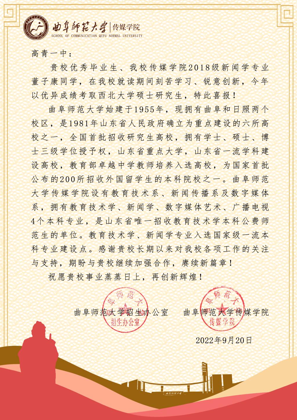 曲阜师大传媒学院讯   近日,传媒学院组织开展的“薪火相传念师恩”高中母校行社会实践顺利收官。2022级曲园学子重返高中母校拜访恩师,并将曲阜师大2022届毕业生考研、就业喜报送达高中母校,宣传学校招生情况和人才培养成果。