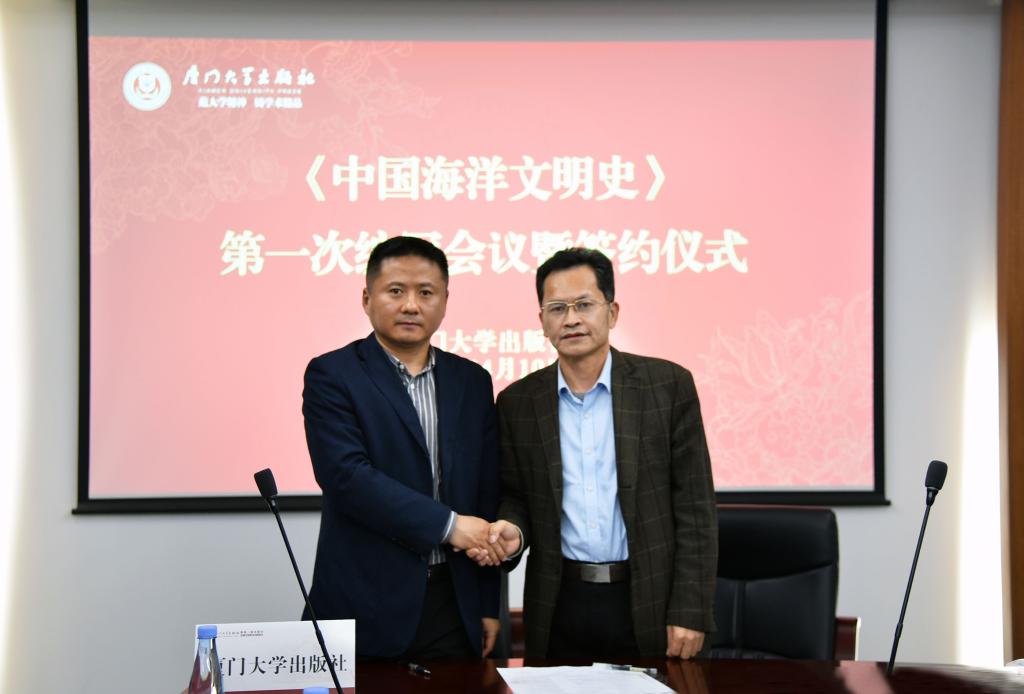 厦门大学出版社总编辑施高翔致辞,并介绍选题策划的缘起。总主编王日根教授介绍《中国海洋文明史》写作框架及写作分配情况。与会专家围绕《中国海洋文明史》撰写整体情况进行了讨论。会上,四位主编与厦门大学出版社郑文礼社长签订约稿协议。
