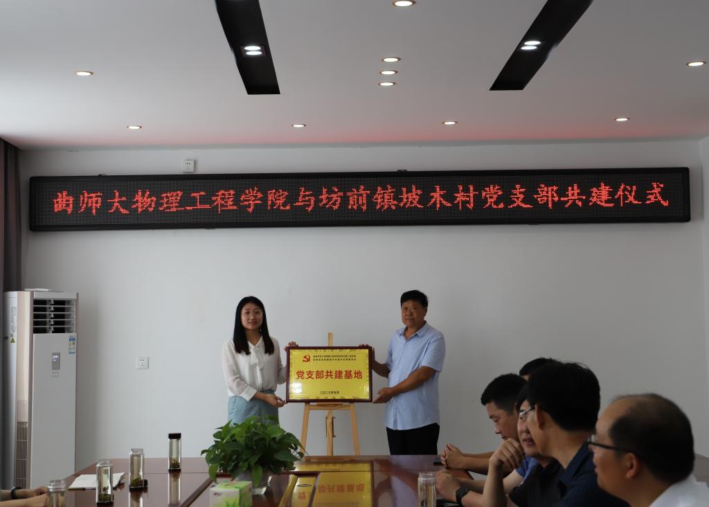 随后,在镇党委举行了党支部共建仪式,本科生第二党支部书记孔瑞与坡木村党支部书记卢绪海为党支部共建基地揭牌。杨志英对莒南县和坊前镇党委政府以及帮扶村干部对第一书记的关心支持表示感谢,双方就下一步合作进行了交流。