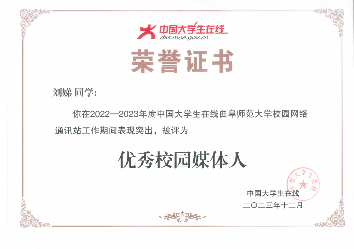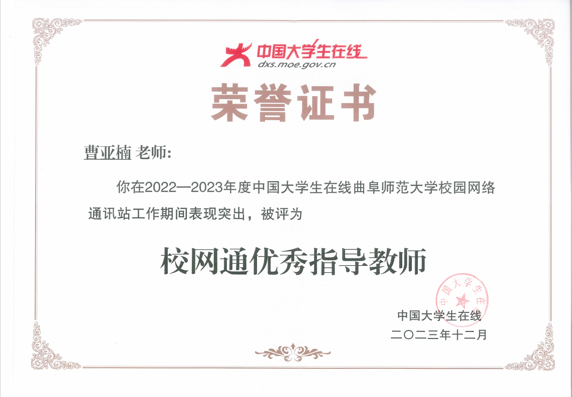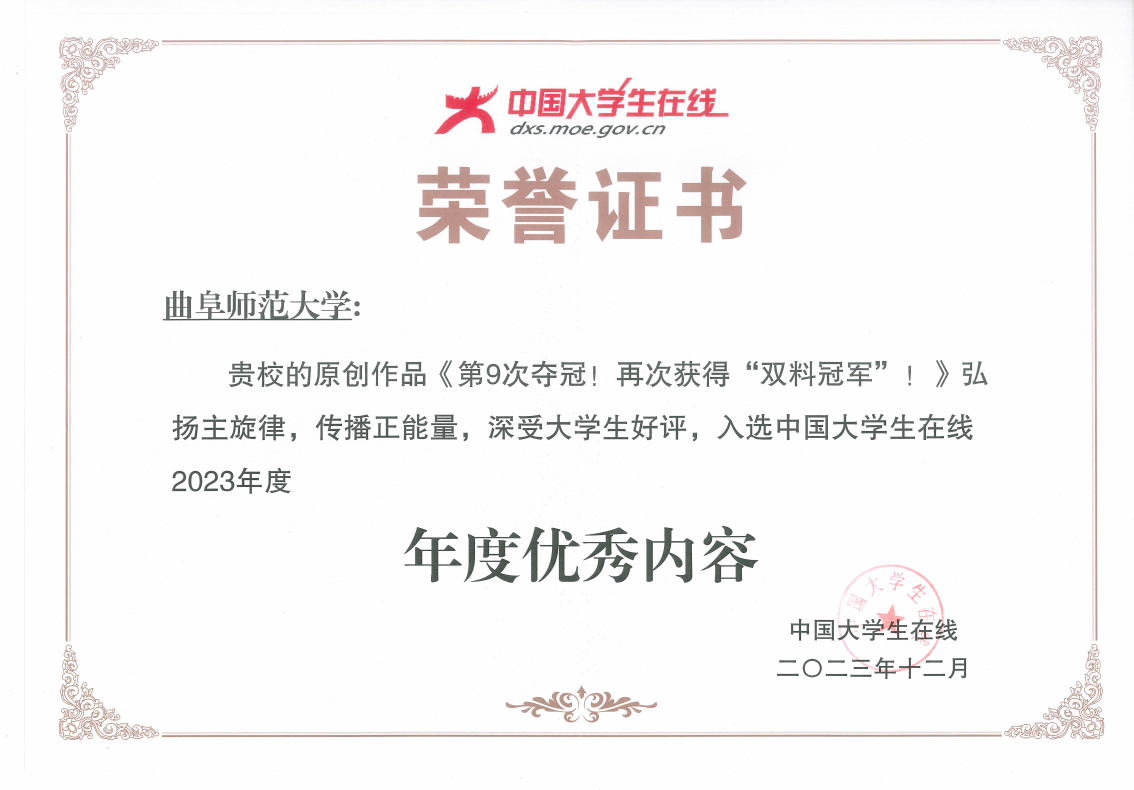 曲阜师大学生工作处讯 近日,中国大学生在线平台发布了《中国大学生在线校网通及校园行活动2023年度表彰名单》,曲阜师大获得多项荣誉。曲阜师大中国大学生在线网通站——XK在线学工在线获“优秀校网通站”称号,曲阜师大学生工作处获“校园行新星单位”称号,原创作品《第9次夺冠!再次获得“双料冠军”!》获评“年度优秀内容”,学生工作处曹亚楠老师获“校网通优秀指导教师”称号,心理学院学生、曲阜师大中国大学生在线校网通站站长刘娣获“优秀校园媒体人”称号。