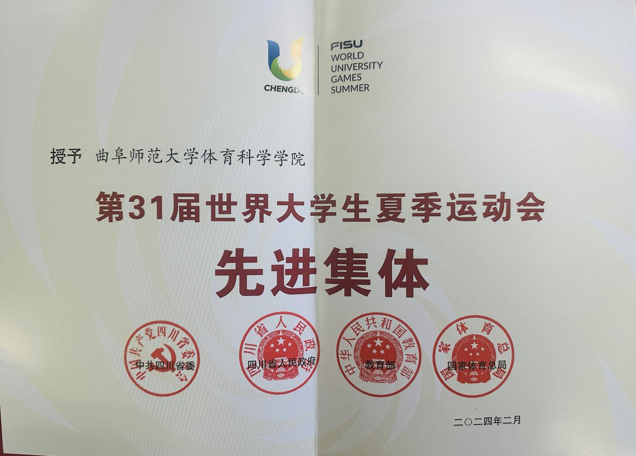 曲阜师大体育科学学院讯 为表彰先进、树立典型,激励广大干部群众建功新时代、奋进新征程,近日,中共四川省委、四川省人民政府、教育部、国家体育总局决定,表彰一批在成都大运会申办、筹备、举办工作中作出突出贡献的先进集体和先进个人,XK在线体育科学学院荣获“第31届世界大学生夏季运动会先进集体”表彰。