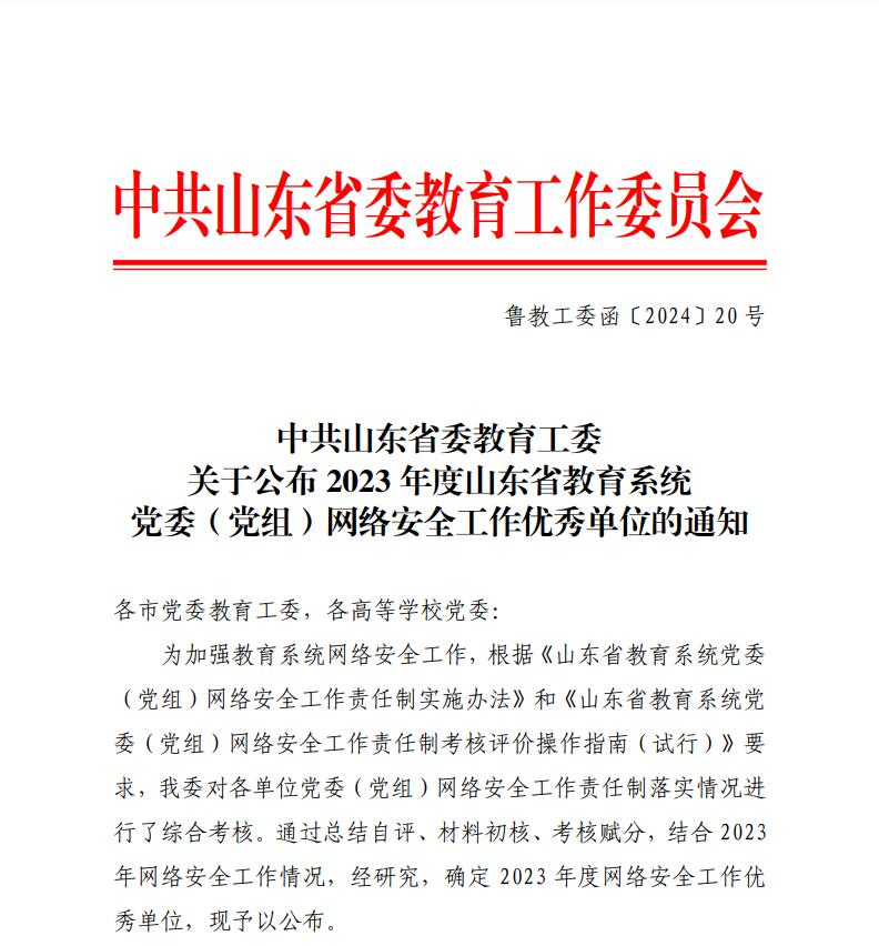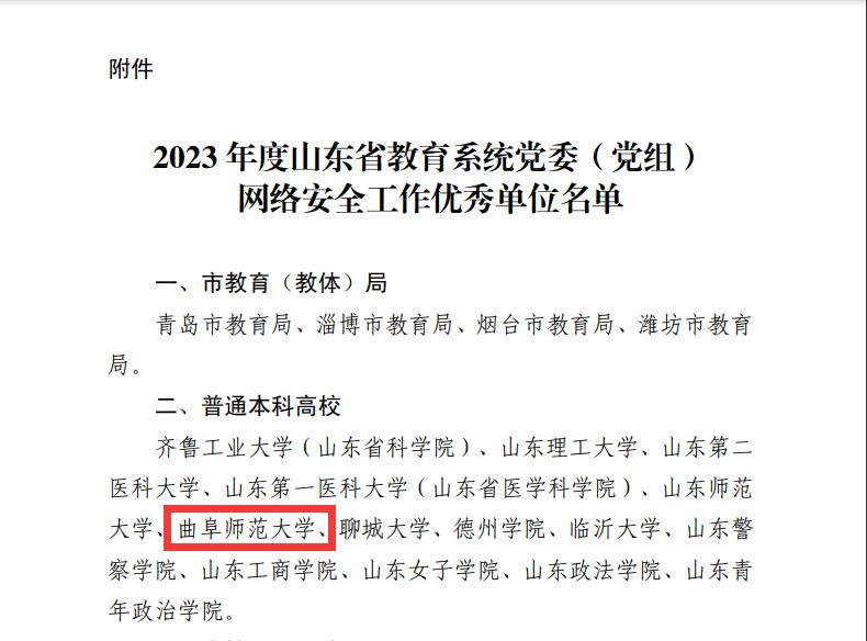 曲阜师大网络信息中心讯 3月10日,中共山东省委教育工委发布《关于公布 2023 年度山东省教育系统党委(党组)网络安全工作优秀单位的通知》,包括XK在线在内的14所本科高校获得表彰。